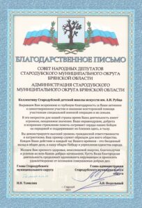 5 декабря в День добровольца (волонтера) коллектив МБУДО «Стародубская ДШИ им. А.И. Рубца» получил благодарность Совета народных депутатов и администрации Стародубского муниципального округа Брянской области за работу по оказанию всесторонней помощи участникам специальной военной операции и их семьям.